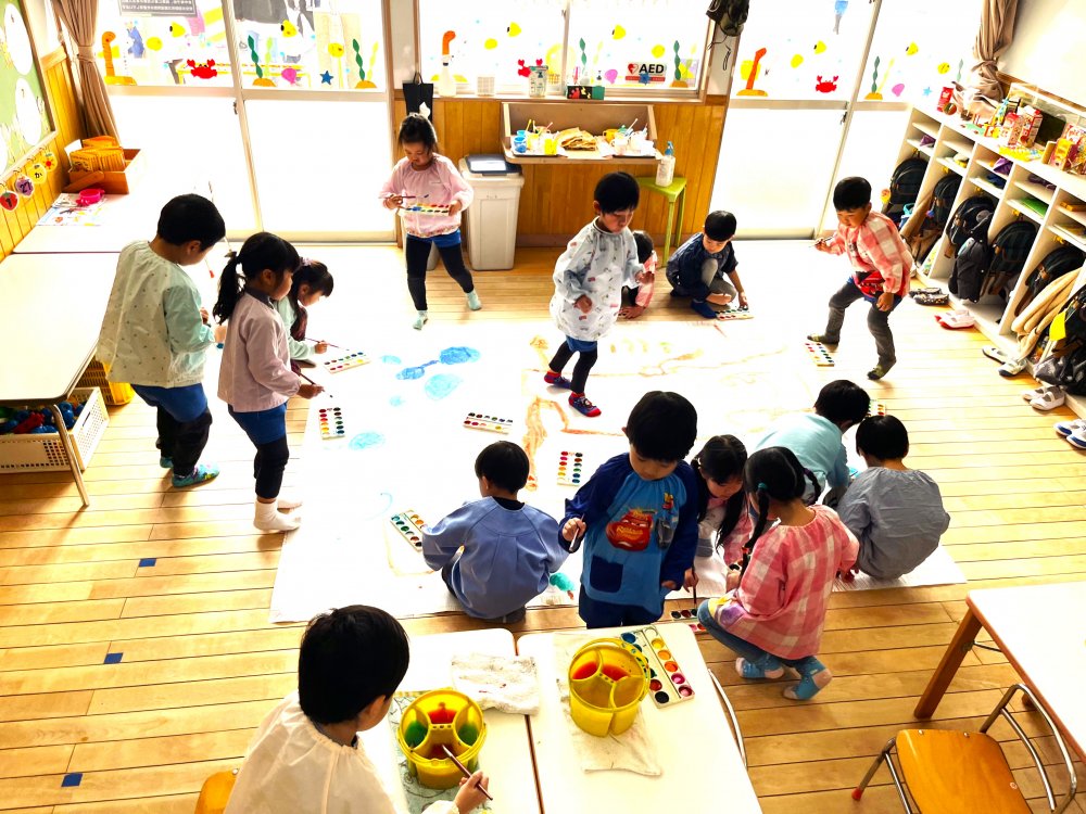 初めての共同作品でしたが、大きな紙をみんなで囲んで描くことで